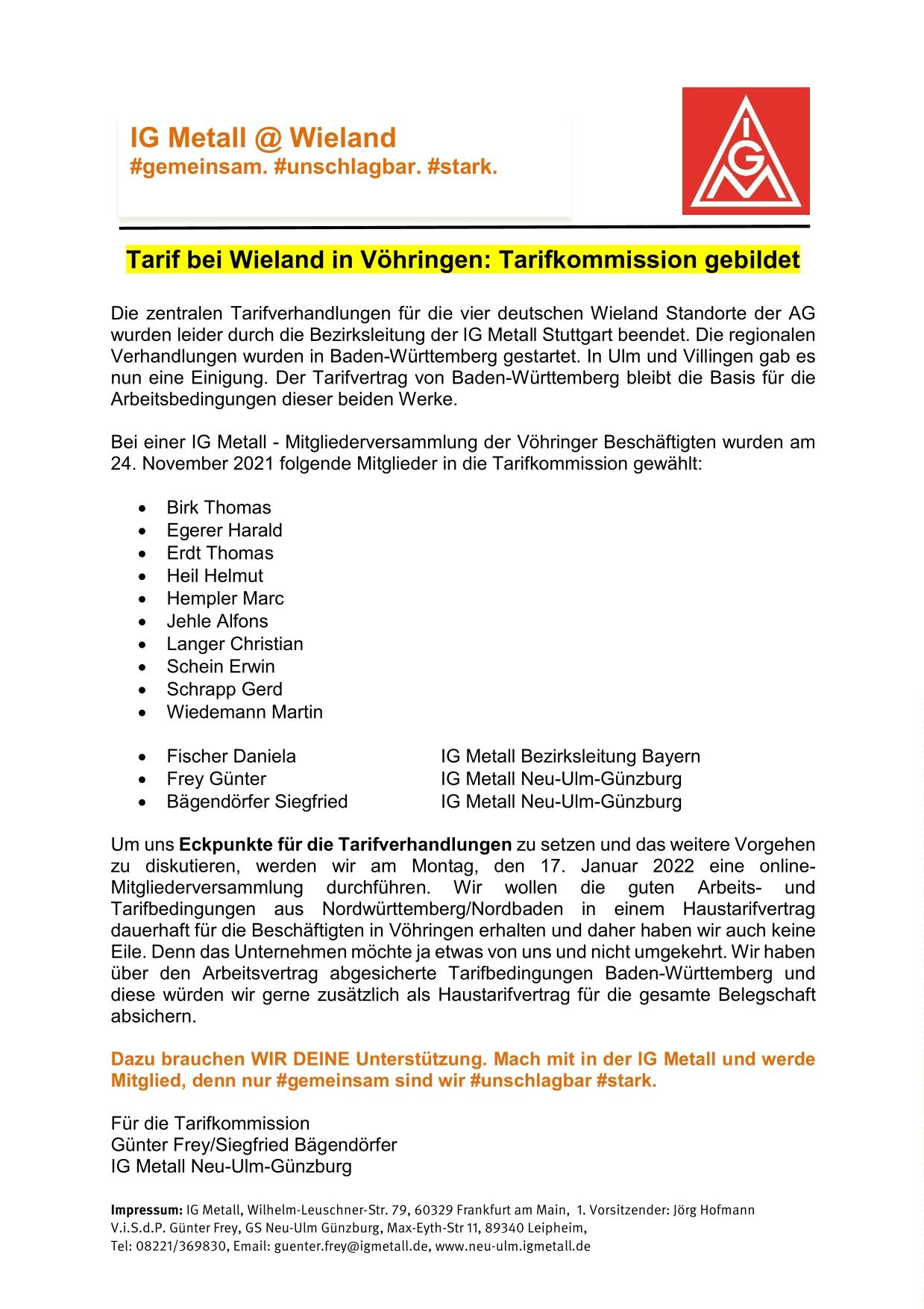 Tarif bei Wieland in Vöhringen: Tarifkommission gebildet